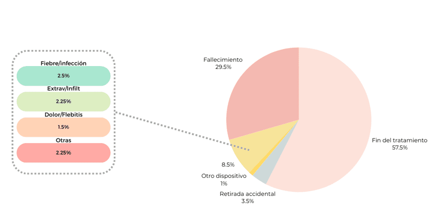 - Motivos de retirada: El 57,5% de los catéteres fueron retirados al finalizar el tratamiento, mientras que el 29,5% fueron retirados debido al fallecimiento del paciente.