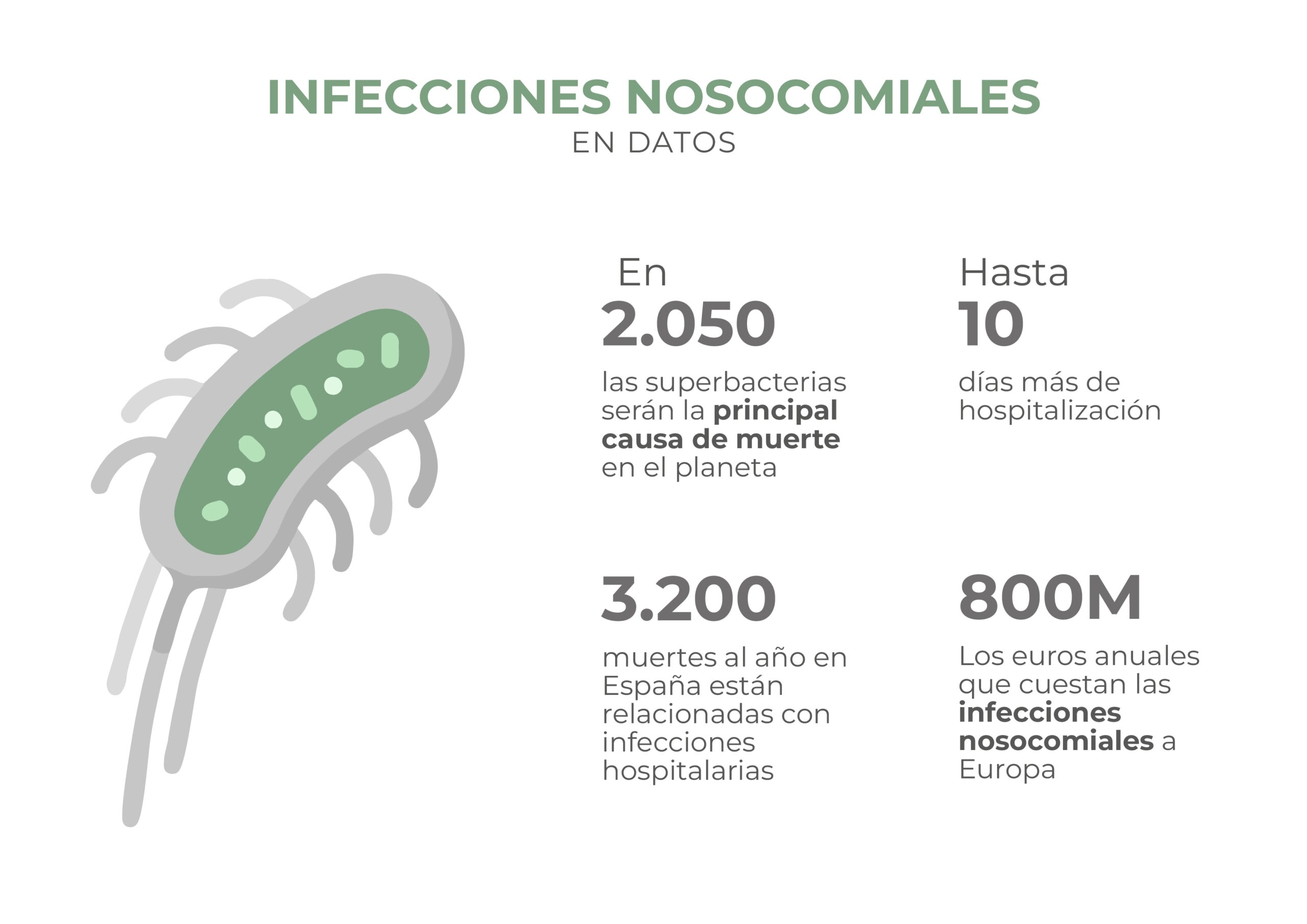 Más de 1,4 millones de personas en el mundo sufren infecciones en el hospital. Se calcula entre el 5% y 15% de las personas ingresadas en un centro hospitalario sufre una infección contraída en el propio hospital y que el 1% de los afectados fallece. A pesar de que en España está ligeramente por debajo de la media europea – un 7% según la Organización Mundial de la Salud (OMS), estos datos representan más de 3.200 muertes al año en nuestro país. (2)