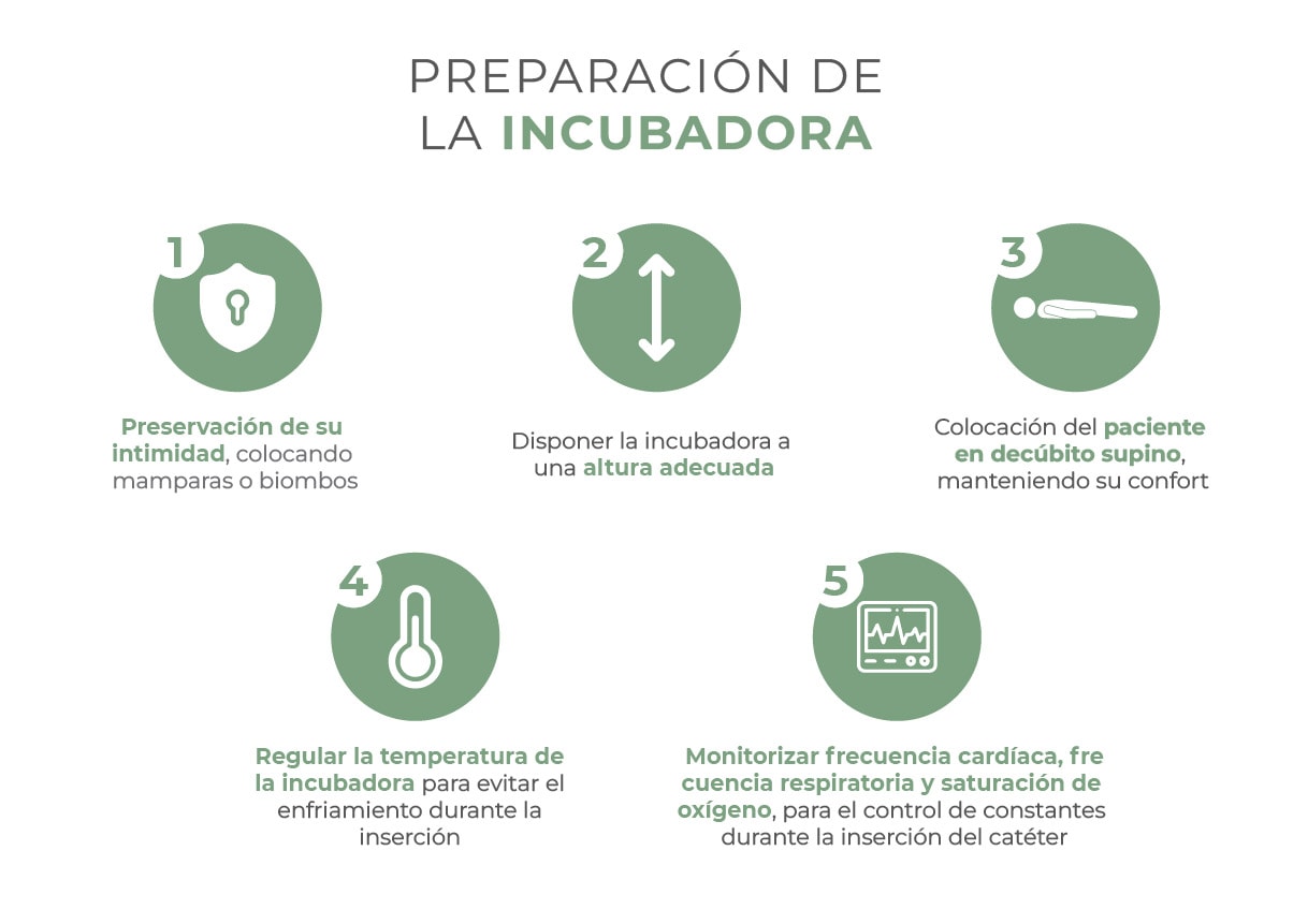 Se recomienda el almacenaje de forma conjunta del material de canalización. Así se facilita la esterilidad del proceso y se asegura la asepsia. Por tanto, dispondremos cerca de la incubadora el carro de canalización y se prepararán los sets de canalización estériles sobre la mesita auxiliar (donde se colocará el campo estéril).