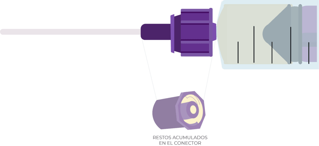 Debido al desplazamiento del fluido cuando se realizan las conexiones con ENFit, en el interior del propio conector o del tapón con rosca que lo protege de patógenos externos, inevitablemente quedan adheridos restos de la solución en el margen de la vía (1).