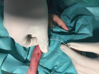- Por el extremo en “J”, utilizando el dispositivo introductor que trae el kit, conectándolo a la cánula canalizada en la vena