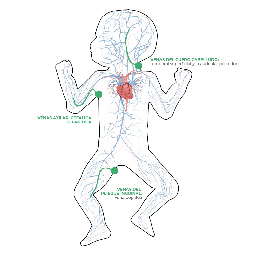 La localización de la punta en los catéteres insertados en extremidades inferiores será el pliegue inguinal. La vena poplítea fácilmente visible en niños pretérminos, pero más difícil de visualizar en niños a término y la fijación y estabilización del catéter tras la inserción puede ser difícil. Las safenas tienen mayor riesgo de presentar flebitis.