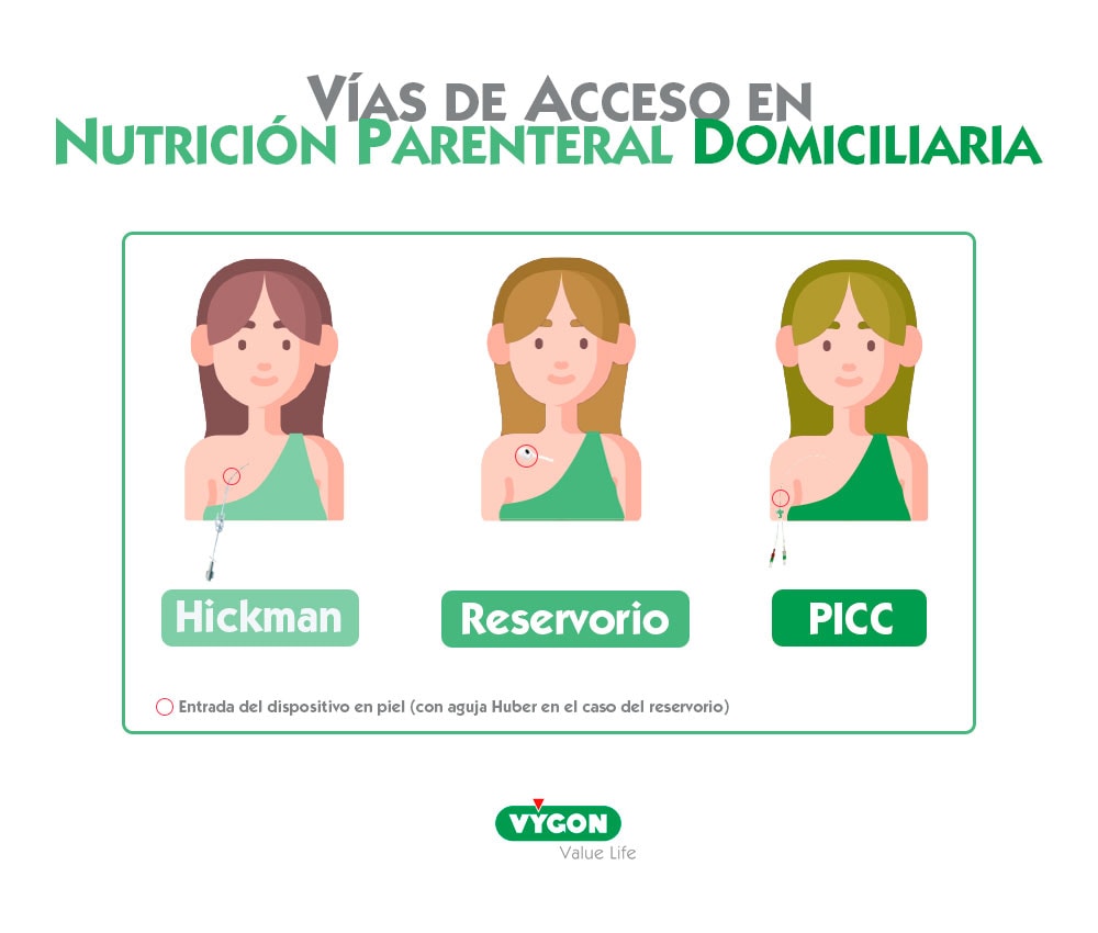 Las Guías ESPEN de accesos venosos en NP (Pittiruti M, 2009), las de manejo del fallo intestinal en adultos (Pironi L, 2016), y las recién publicadas sobre NPD (Pironi L, 2020), recomienda el catéter tunelizado y en su defecto el reservorio o port para la NP a largo plazo (>3-6 meses) y relegan el PICC a la NPD a corto-medio plazo.