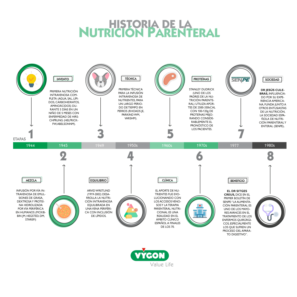 Buscando el origen del uso de la vía parenteral para suministrar estos nutrientes nos remontamos a las primeras décadas del siglo XX encontrando fechas significativas :