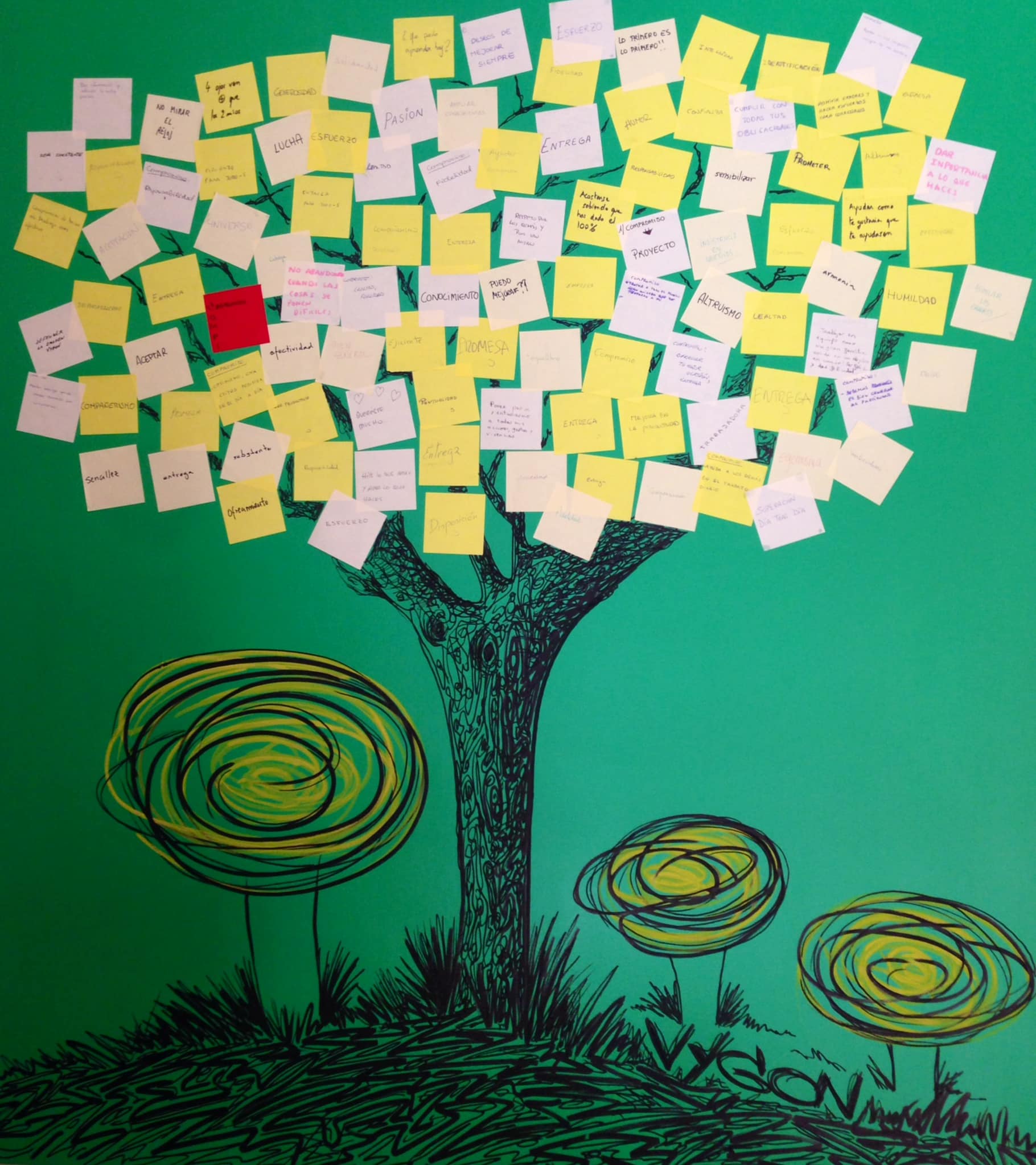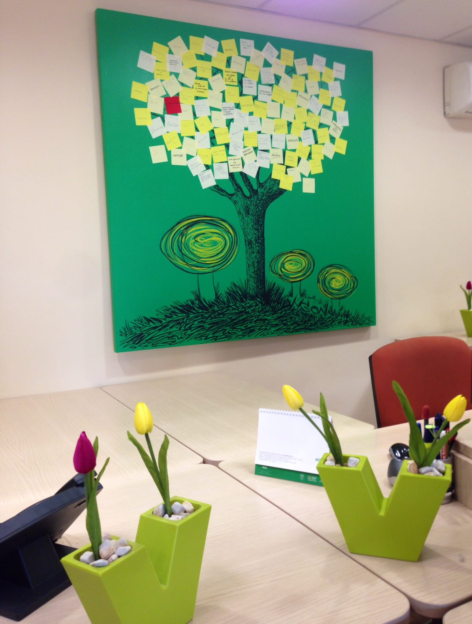 Paseando por el edificio podemos encontrarnos con los 5 árboles de los 5 valores Vygon. Cada árbol representa uno de los valores de la organización (compromiso, orientación a la mejora, mentalidad abierta, personas e integridad) y están compuestos por post-its donde cada empleado ha escrito lo que ese valor significa para él o ella. A la entrada del almacén nos topamos con un mural, de 8 metros de altura, con el árbol que Fernando Jiménez ha diseñado para nosotros basado en el dibujo de esa niña de 8 años. Pero, además, todos los despachos están pintados con árboles mediterráneos que nos recuerdan dónde estamos y, lo mejor, ¡no necesitan riego!
