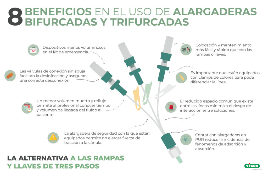 El acceso a las alargaderas bifurcadas y trifurcadas se realiza mediante sistemas cerrados sin aguja, además estos son fácilmente desinfectables y precisan de una menor manipulación que las rampas. Por tanto, utilizando estos dispositivos, no solamente se reduce este riesgo, sino que, además, se ahorra tiempo de enfermería.