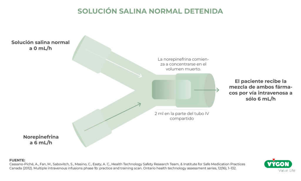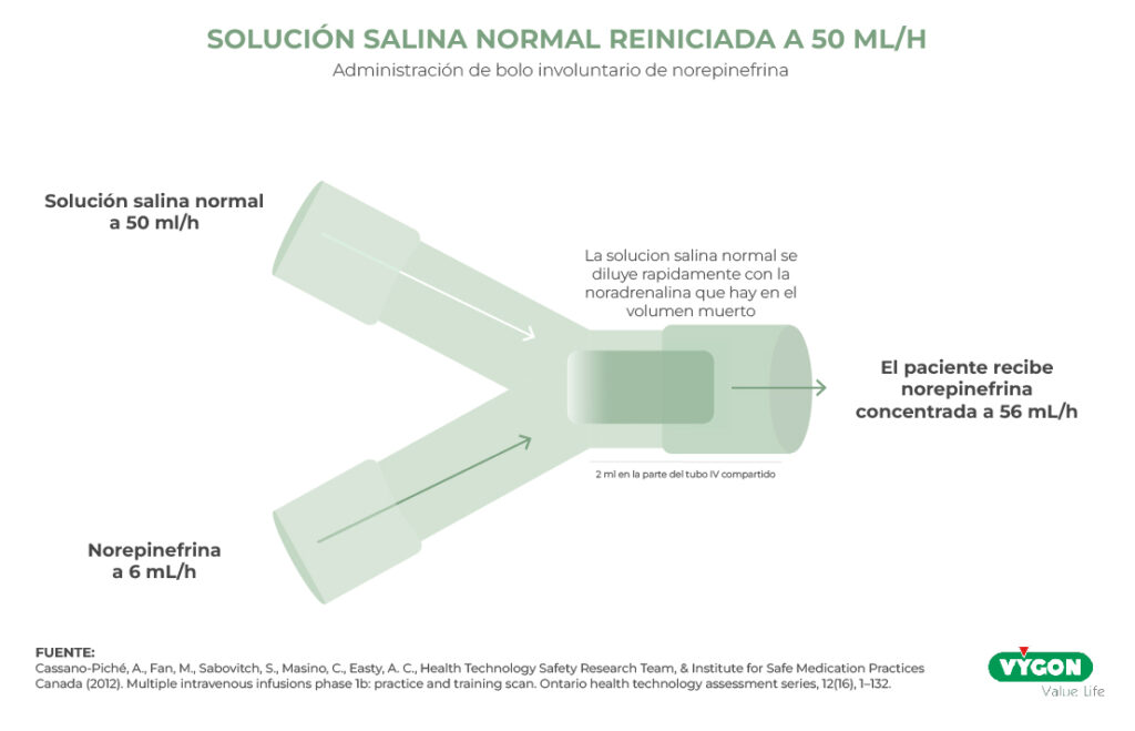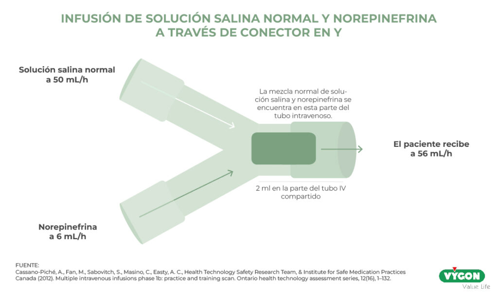 En la imagen anterior se puede observar la infusión de un medicamento, norepinefrina, y solución salina normal. A pesar de que cada uno está controlado individualmente por una bomba de infusión y tiene su propio tubo, están conectados al mismo catéter intravenoso a través de un conector en Y, compartiendo un espacio común.2