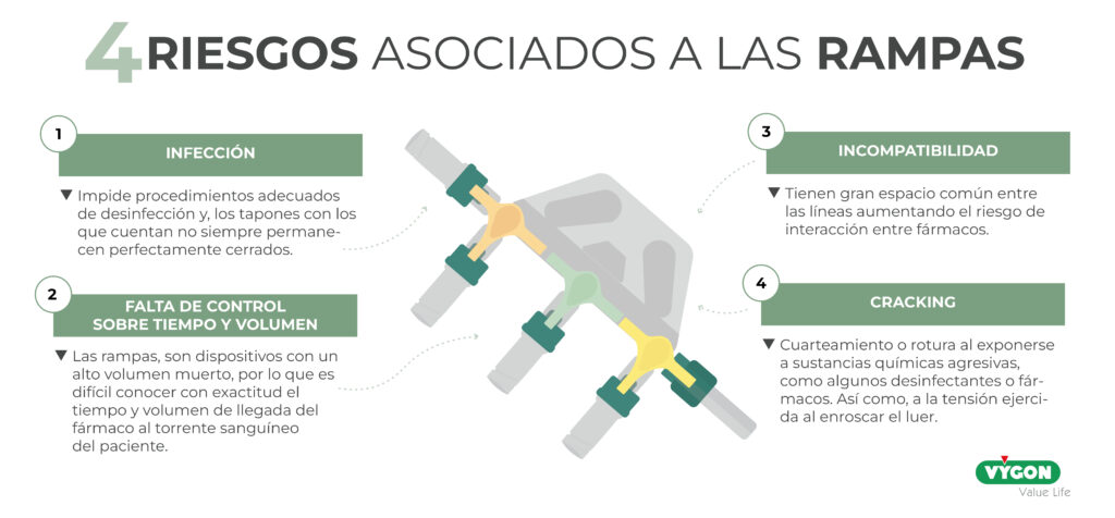 Como hemos comentado, los cuatro riesgos más importantes que nos encontramos al utilizar las rampas son infección, falta de control sobre la infusión, interacción entre los diferentes fármacos y cracking. Además, la probabilidad de flebitis mecánica aumenta a medida que el punto de infusión se acerca a la piel del paciente.