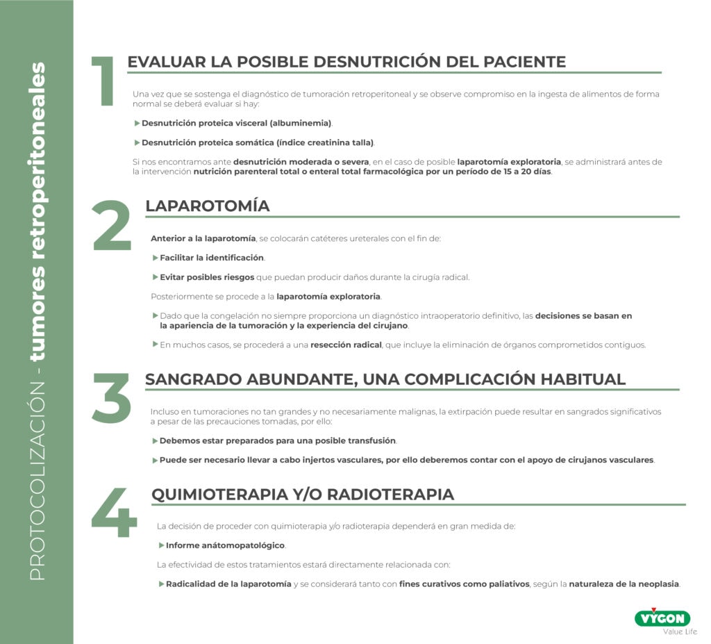 Los tumores retroperitoneales constituyen todo un desafío para los cirujanos debido a su ubicación inaccesible, su comportamiento clínico impredecible y la complejidad en su tratamiento. 5 No obstante, protocolizar las técnicas quirúrgicas radicales y agresivas en combinación con un correcto soporte nutricional farmacológico puede marcar la diferencia y permitir un buen pronóstico, incluso en pacientes aparentemente inoperables, irresecables o incurables. 7