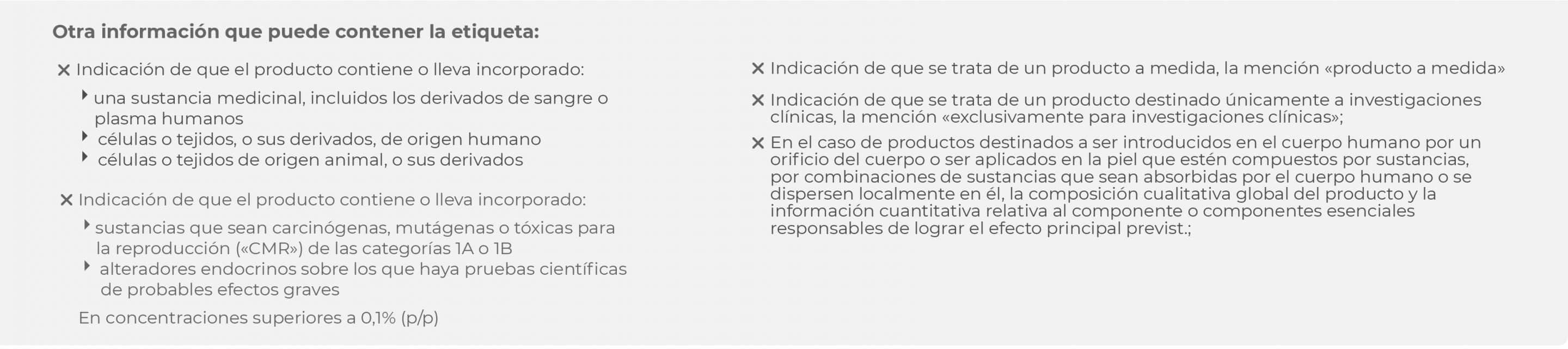 Además de los símbolos mencionados anteriormente, existen otros signos que, en combinación con los anteriores, pueden encontrarse en los etiquetados de los productos sanitarios.