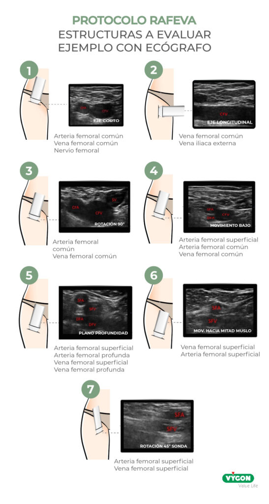 - Pasos a seguir en el método RaFeVa: 7 pasos a seguir mediante ecografía y rotaciones de la sonda ecográfica a lo largo del muslo y zona inguinal.