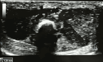 En aquellos casos de mayor complejidad en los que podamos dudar de la canalización accidental del vaso arterial podemos realizar una visualización en plano transversal. Este plano nos permitirá visualizar un punto hiperecogénico correspondiente a la guía metálica en el interior de la luz del vaso canalizado. De manera habitual podemos encontrar la imagen de la guía reposada en la zona inferior de la luz del vaso.