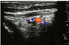En las siguientes imágenes podemos observar la guía metálica en el interior de la luz del vaso izquierdo y posterior identificación del vaso arterial en la zona axilar mediante el uso del Doppler color. Esta simple comprobación nos permite asegurar la correcta canalización del vaso venoso con datos objetivos.