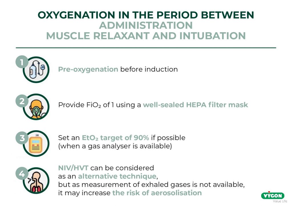 In the COVID-19 patient with respiratory difficulties, preoxygenation is of paramount importance because of the high probability of hypoxemia, and because the duration of respiratory difficulty management may be longer than in a patient without difficulties.