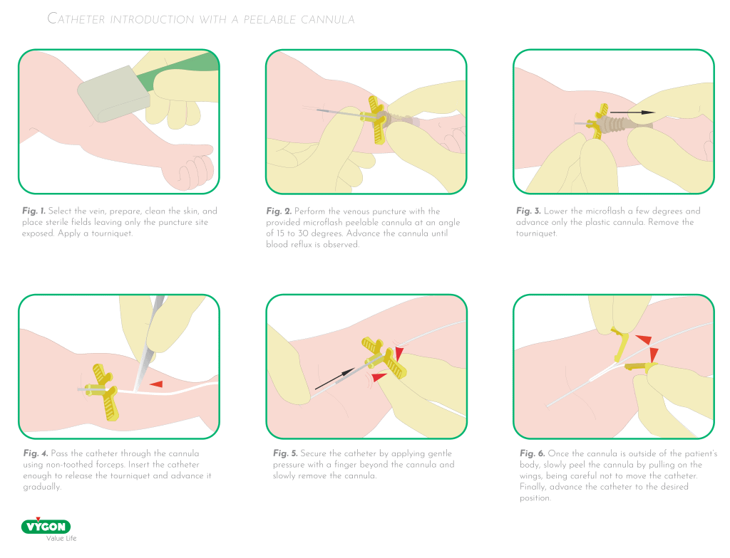 The short cannula or catheter is not recommended unless as a last resort. Since it cannot be removed, it must remain on top of the catheter during use, increasing the risk of infection and mechanical damage (obstruction and phlebitis). Additionally, specific PICCs are required to securely fix the cannula to the catheter.